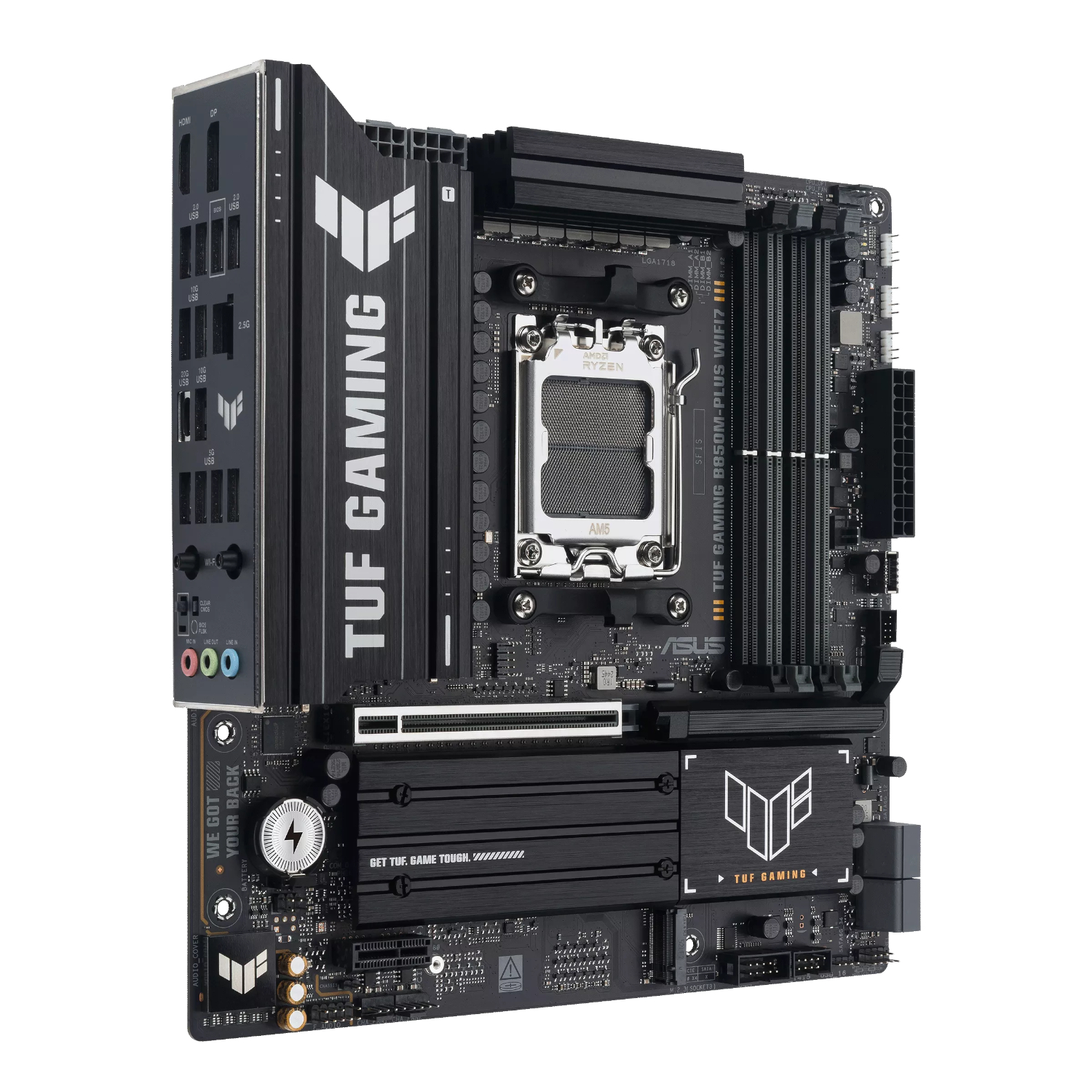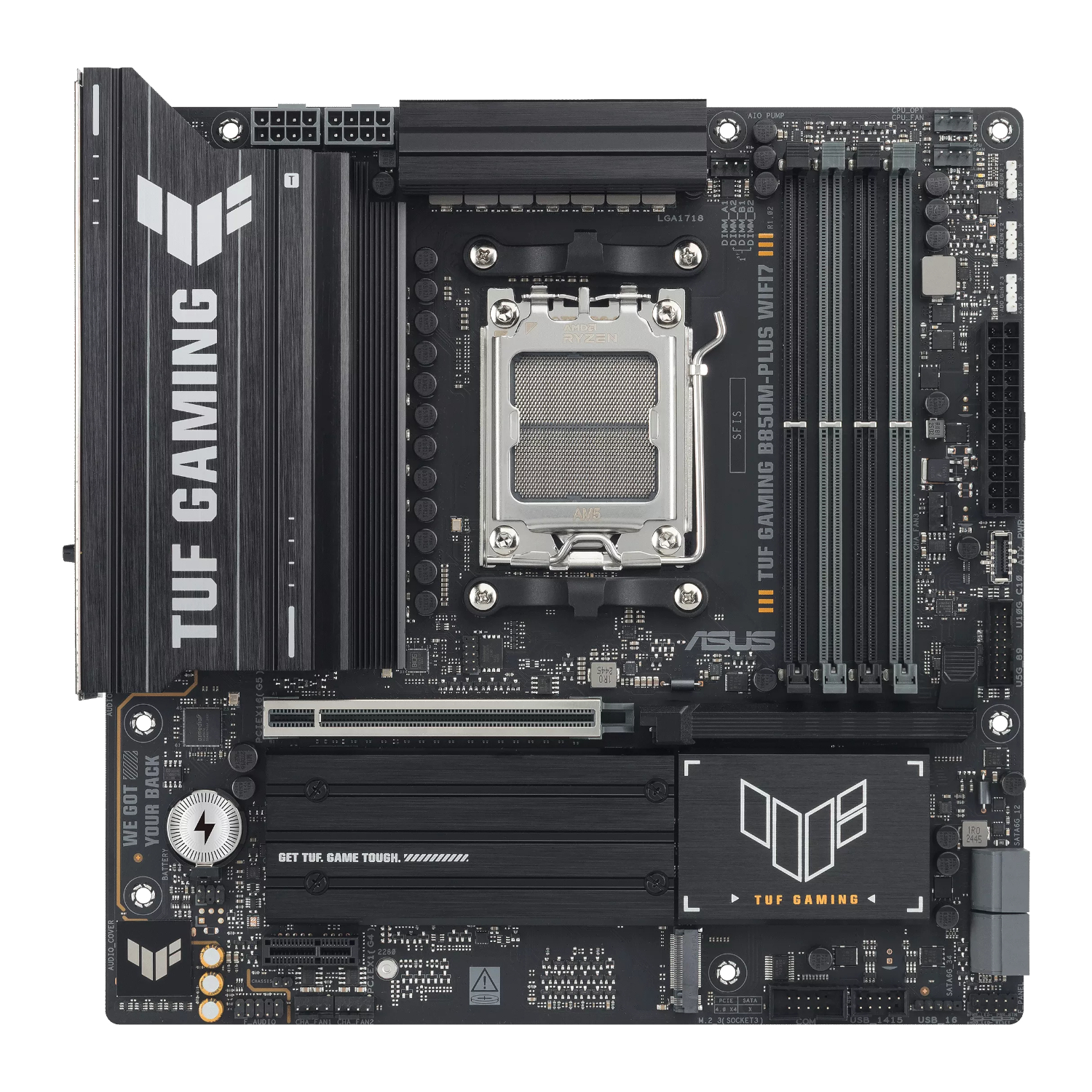ASUS TUF Gaming products are synonymous with durability. The B850M-Plus WIFI II features TUF Protection, including TUF LANGuard for surge-protected networking, ESD Guards for electrostatic discharge protection, and an improved VRM heatsink for superior heat dissipation. These elements, combined with the military-grade certification of TUF components and rigorous testing, ensure that this motherboard is not just built for performance, but for longevity, providing peace of mind for years of gaming and computing. Choosing this TUF motherboard means choosing lasting power for your AM5 setup.